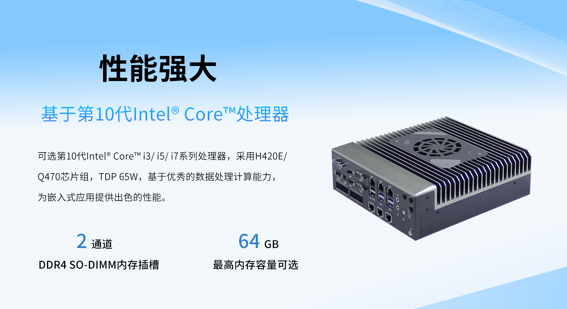 产品分类:通用;处理器:第10代 Intel Core i3/ i5/ i7系列处理器 (LGA1200插槽);内存:2 x DDR4,最高64GB内存;网络:N/A;环境温度:Industrial range。以上参数可用于项目初筛与兼容性评估。