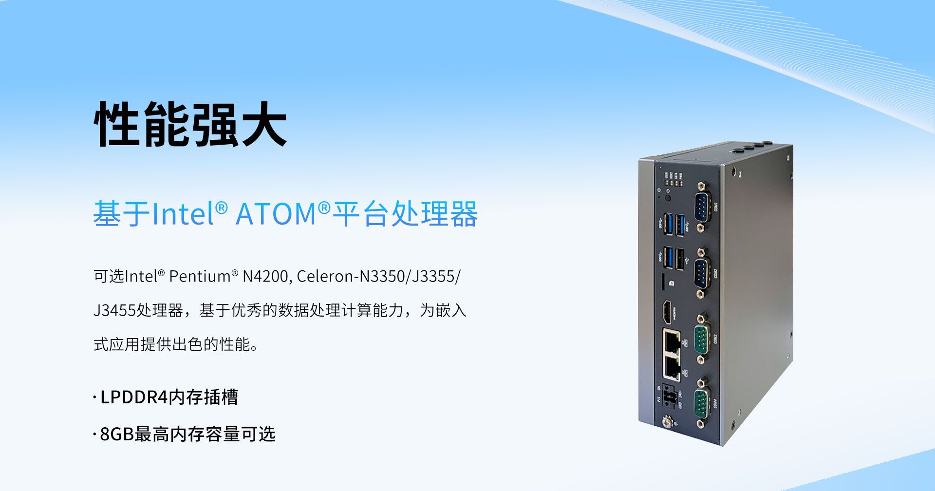 产品分类:超紧凑迷你型;处理器:Intel Apollo Lake SoC处理器;内存:LPDDR4(Max. 8GB);网络:N/A;环境温度:Industrial range。以上参数可用于项目初筛与兼容性评估。