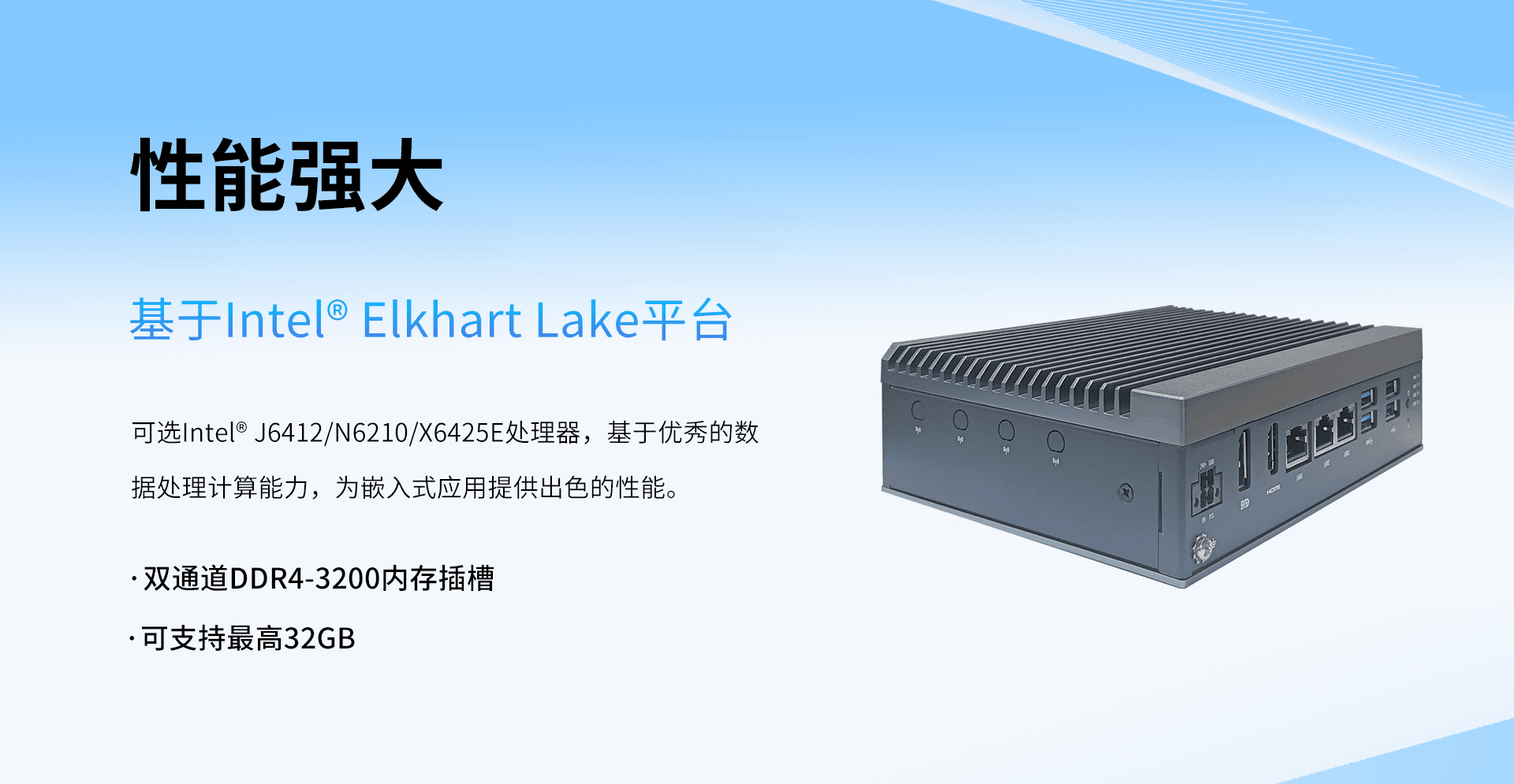 产品分类:超紧凑迷你型;处理器:Intel Elkhart Lake J6412, N6210, X6425E;内存:2 x DDR4-3200 up to 32GB;网络:N/A;环境温度:Industrial range。以上参数可用于项目初筛与兼容性评估。