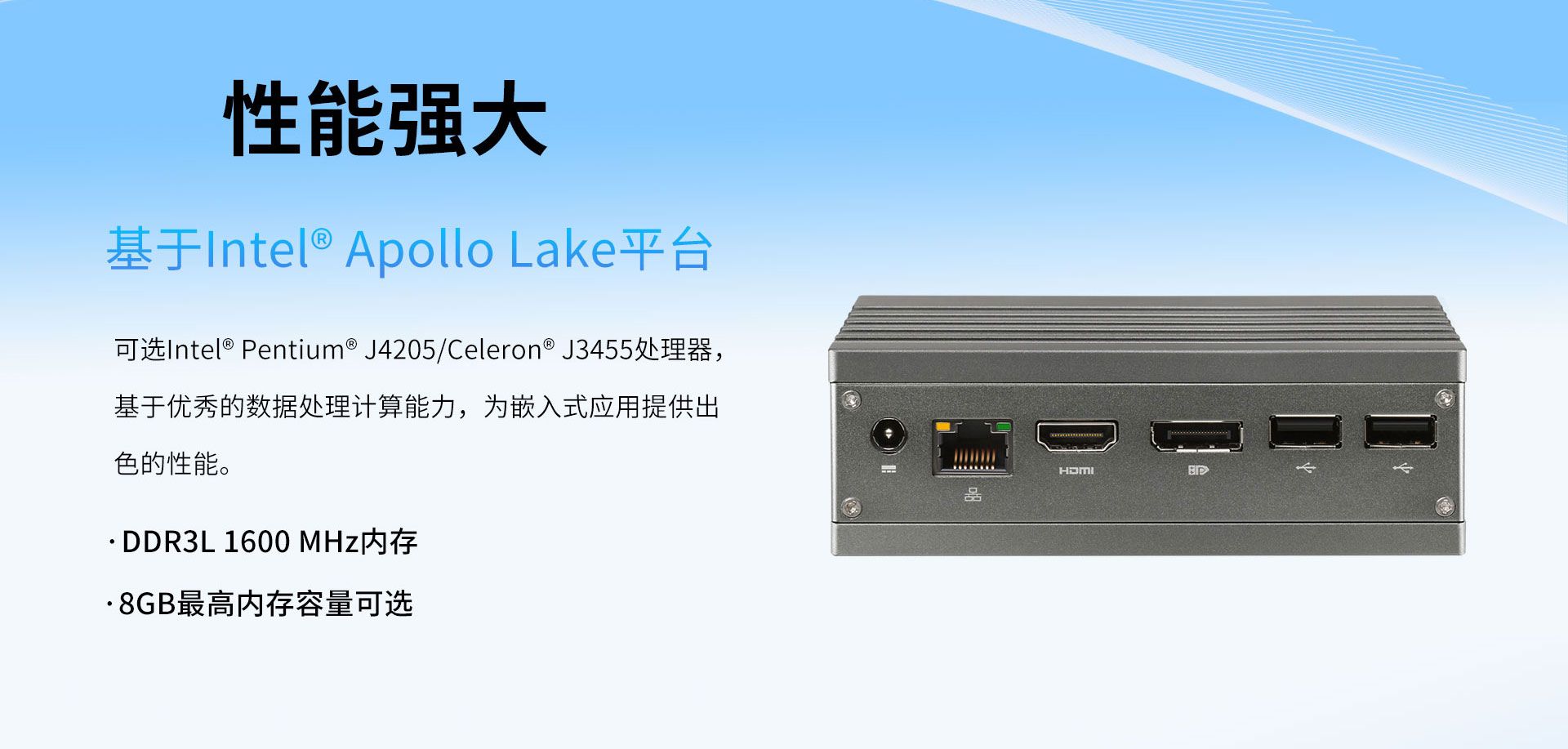 产品分类:超紧凑迷你型;处理器:Intel Apollo Lake SoC处理器;内存:DDR3L (Max. 8GB);网络:N/A;环境温度:Industrial range。以上参数可用于项目初筛与兼容性评估。