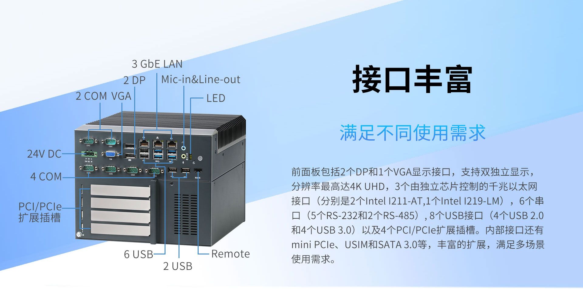 | Expansion | Mini-PCIe | 1 x full-size mini-PCIe, Support WLAN/WWAN module |