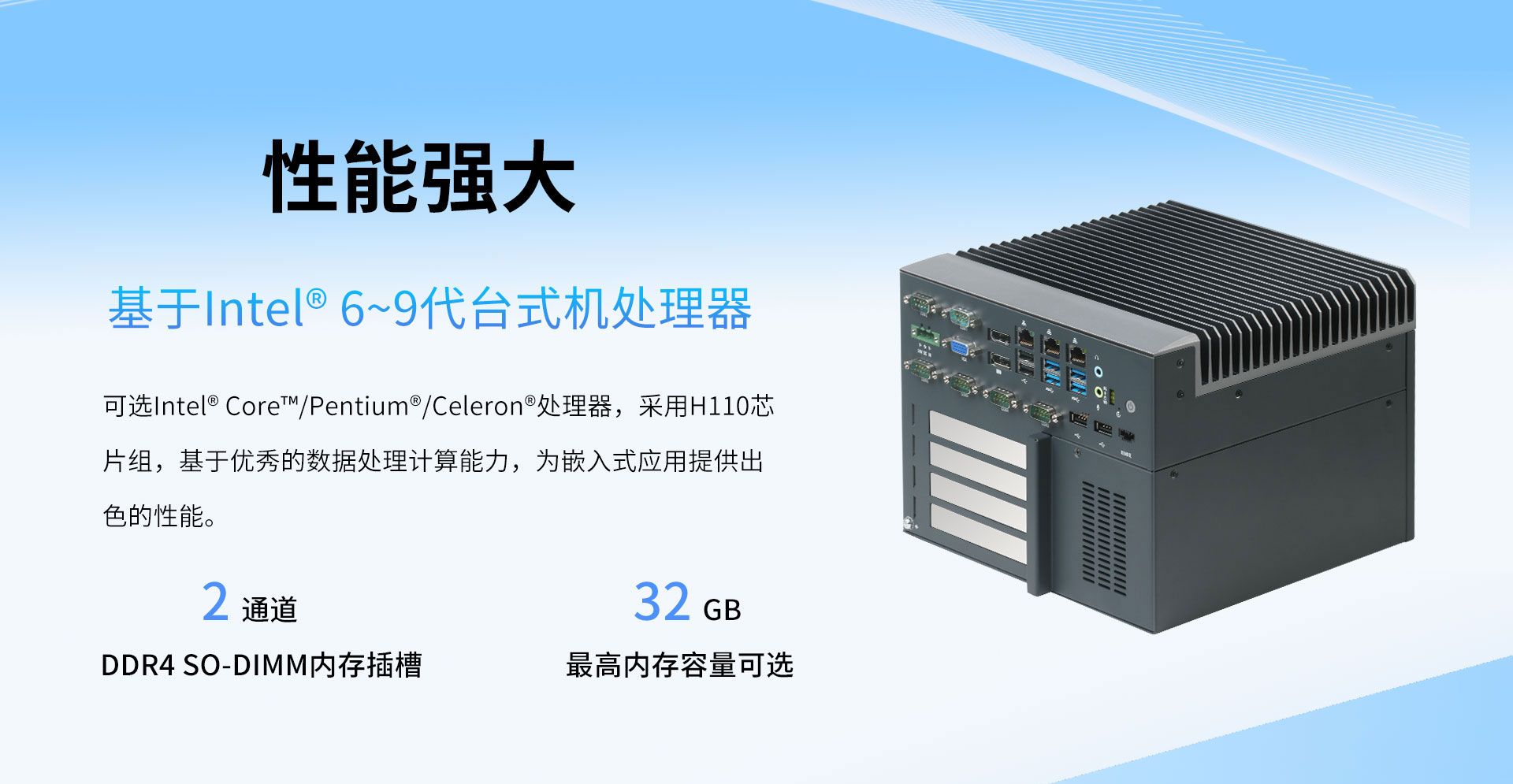 产品分类:可扩展嵌入式;处理器:Inter 第六至九代台式机处理器(LGA1151);内存:2x DDR4 SO-DIMM (Max.32GB);网络:N/A;环境温度:Industrial range。以上参数可用于项目初筛与兼容性评估。